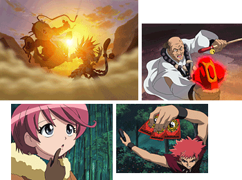 ヤクモとショウカクの激しい戦いは決着がつかずに終わる。妖怪退治にやって来たリクたちの前に立ちふさがるのは地流スバルと、凶暴なまでのかわいさを発揮する“椿のホウシュン”。コゲンタたちは戦うことが出来ない。しかし、リクはスバルが式神と別れたくないばかりに戦いを避けていると見抜く。ソーマはスバルに自分を重ね合わせ、戦いを教える。 そこへ突如鬼門から妖怪が。怖がるスバルを励ますソーマとホウシュン。スバルは勇気を奮い起こし、ついに妖怪を撃退。 その時、「天流となれ合うなど恥を知れ!」と地流四部長タイザンと“霜花のオニシバ”がホウシュンを撃ち捨てる。挑みかかるリクとコゲンタは、鬼門を通じ某所へと送り込まれてしまった。 |
